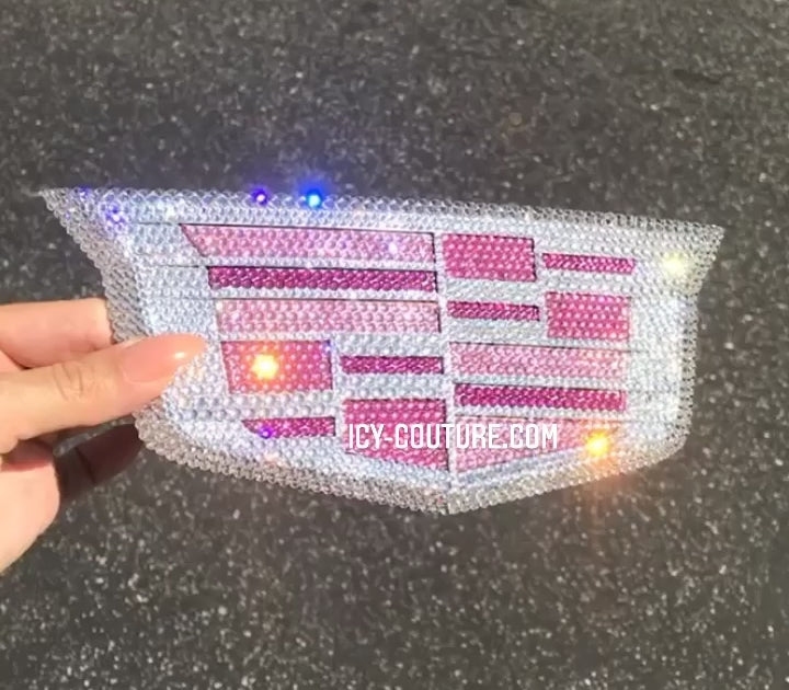 PREMADE CADILLAC FRONT GRILLE EMBLEM — GM PART #23444634 — CRYSTALLIZED IN ICY COUTURE’S PINK DIAMONDS THEME. THIS EMBLEM IS HAND-CRYSTALLIZED WITH PREMIUM GLASS RHINESTONES FOR A SHOWROOM-STYLE SPARKLE AND IS READY TO SHIP FOR IMMEDIATE INSTALLATION.