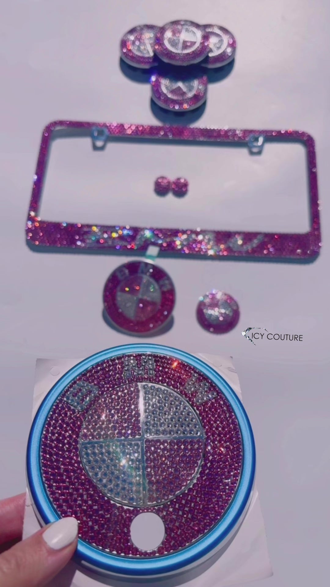 ICY Couture does not use rhinestone stickers. We specialize in luxury customization using genuine replacement emblems and professional-grade crystal application.